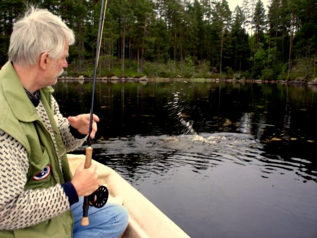 For once, we spend the midsummer holiday on the island of Väddö with Bibi’s sister and company. Very pleasant, but I miss the special feeling of a Dalarna midsummer with fiddlers and folk costumes. Bibi then flies off to France to attend a family reunion. She sends me a picture of herself “shrimping” in the waves in Normandie. As for myself, I spend three magic summer nights in my belly-boat on lakes Nysjön and Ågsjön. The Ephemera vulgata is hatching and I lose the largest trout I have hooked for many years. Following a couple of heavy rushes, the line slackens and a mighty tail fin teasingly waves goodbye.