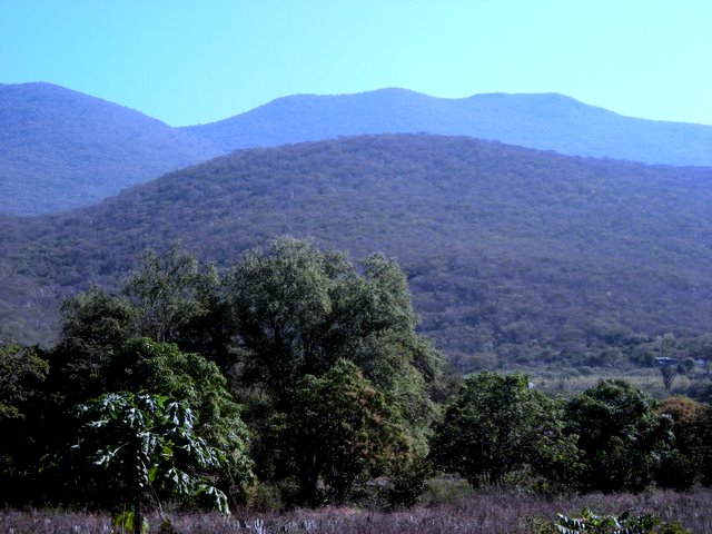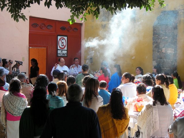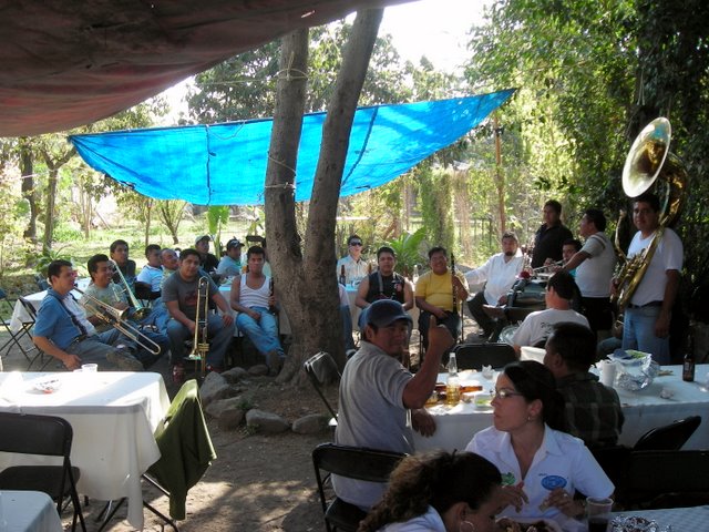A major event of the year is the weeklong celebration of the patron saint, “La Vírgen del Pueblíto”. Almost daily, processions pass through the village with loud music and firecrackers popping along its route. At night, people have private parties, where they eat, drink and listen to booming ranchero music. This usually goes on well into the small hours of the morning. During the fiesta, each day is an adventure. One morning we encounter two giant oxen, decorated with all kinds of vegetables, come thundering through the narrow street with a large congregation of people in tow. That afternoon the oxen will be slaughtered, and everyone is invited to enjoy a nourishing broth. One night our next-door neighbors, the Ramirez family, invite us to with other friends and, share a meal of mole with pork. A milk-like drink, pulque, made from fermented agave leaves with a slightly intoxicating effect, is served with the food. Beneath a blue tarp, strung up between the trees, is an 8-l0 man orchestra that adds to the festive mood. The evening is pleasantly warm, and at dusk when the music eventually quiets down, the sound of a thousand cicadas fills the air with their song. |