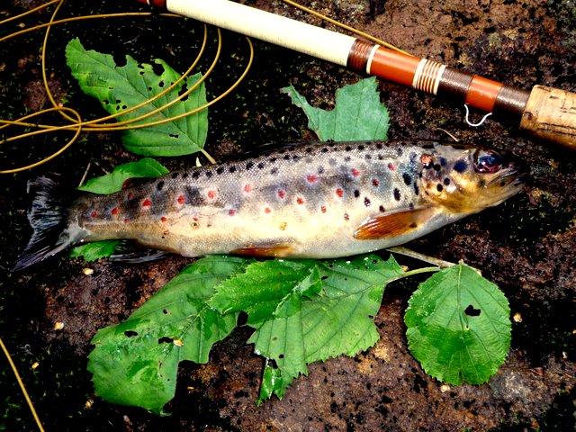 At the end of the month I make one last trip to one of my small trout streams. In my breast pocket, a tin box with about ten flies, among them my favorite, the Wooly Worm. The terrain is cumbersome and branches and tufts grab after sloppy back-casts. It turns out to be a good day, though. The trout are not big, but attack like lightning from their lies under overhang and behind rocks. Toward evening the stream darkens below heavy skies, and when the last fish of the day flap about in the grass, the rain is pouring down. Wet, and somewhat stiff, I make my way up to the road. Of the ten flies I carried, hardly half are left - the others decorate trees and bushes along the banks.