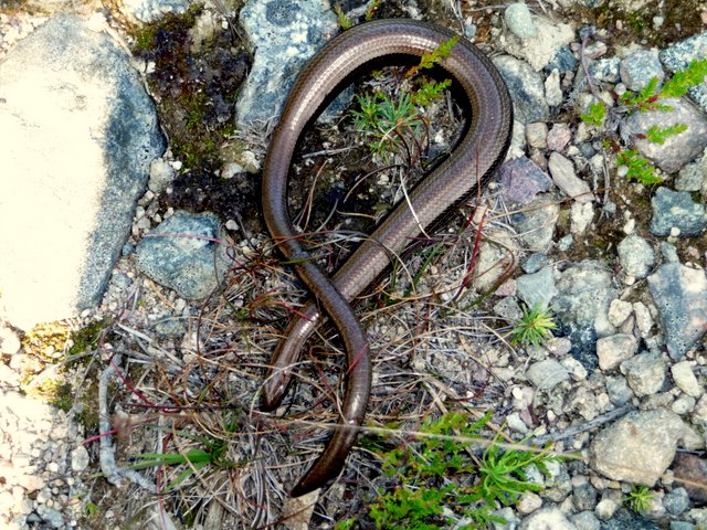 The slowworm lies like a decorative sling on the path. After a cold night it