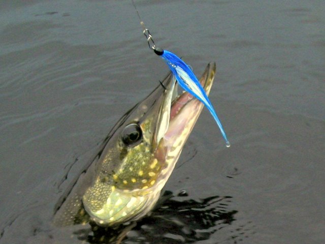 Joe Brooks, American fly fisher and writer, was the adventurer not content with the usual travel destinations. During a time when we still thought of a fishing trip to Norway as a bit exclusive, Joe visited exotic places and caught exotic fish that we had not even heard of. When he died in 1970, he left to posterity, a series of flies, commonly called “Brooks’ Blondes”. One fly, “Argentine Blonde” tied on hook 2/0, gave me several pike last autumn and the same pattern opened this season. The first pike sank without hesitation his teeth into the slim blue-and-white streamer. Bibi mastered the oars and besides had time to make a picture.