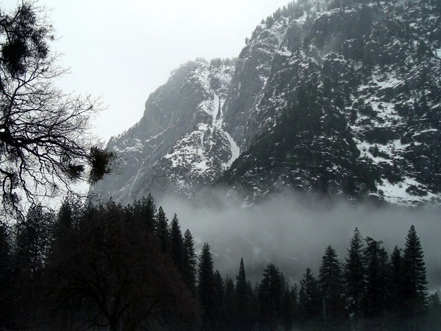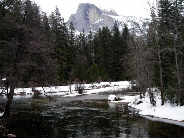 This view, usually photographed in summer, with the Merced River with Half Dome in the background, often turn up in fishing articles and books. For those who want to fish here, a barb-less hook is the rule. The rainbow is natural to Yosemite, and is not to be killed. Brown trout, on the other hand, is a newcomer and may be caught and eaten, if you are happy with five per day. What else? Yes, on Sunday morning we went to the village church, and since we were visitors from far away, the small congregation applauded us.