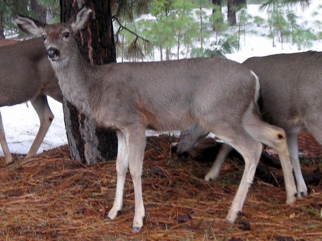 We don’t see much animal life at this time of the year, but we succeed in getting a picture of a group of unafraid mule deer that have gathered on snow-less ground. Otherwise there are, besides many different birds, fox, squirrel, raccoon, coyote, rattlesnake and black bear. Mountain lion (puma) live on the slopes, a cat of about 70 kilograms of pure muscle. A brochure informs you how to behave if you encounter an aggressive puma. “Stand still – look the cat in the eye – wave your arms and yell – throw objects at the animal. If, in spite of this, the puma, attacks you, STRIKE BACK!!!”