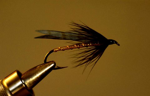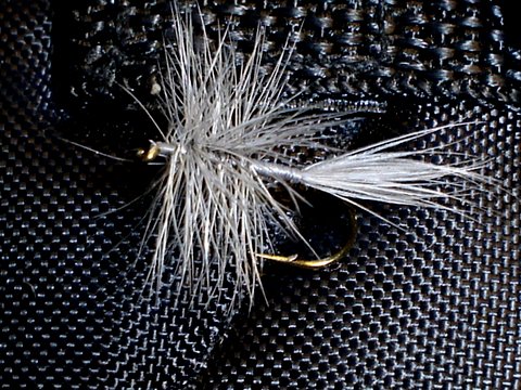 I call it the minute-fly, since it seldom takes more than a minute to make. The tying thread is grey, hackle and tail Blue Dun-colored, hook No. 12, 14 or 16. I tie in the hackle feather just behind the hook eye, wrap the feather 3-4 sparse turns toward the hook bend, then 3-4 turns toward the hook eye through the previous turns and then tie off. The fly floats well and, although not an imitation, gives an illusion of a mayfly riding high on the surface film.