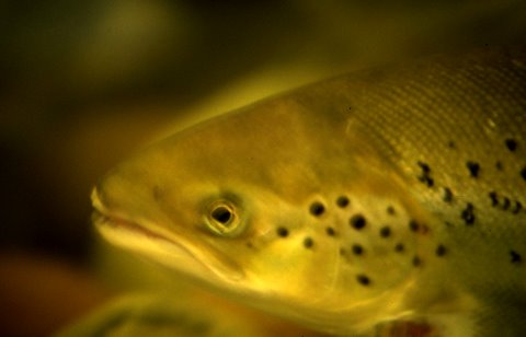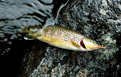 Articles on fly-fishing often claim that a streamer is meant to copy a small fry. Personally, I have never been altogether convinced that a sharp-eyed trout actually would confuse a streamer with a small fish, even if the imitation is cleverly made. Most of our streamers, like Appetizer, Whiskey Fly, etc., actually do not represent anything at all, but have qualities that attract the fish. The trout in the picture fell for a Mickey Finn, a streamer where a bright red band between yellow fields apparently affords a strong incentive.