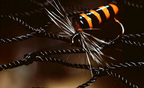 An exaggeration may be that of a particularly profuse hackle, emphasizing a special color, extra sheen to the fly body, or an overly marked segmentation, as shown in this balsa fly. When it comes to streamers, a protruding pair of eyes may give a tempting signal.