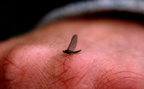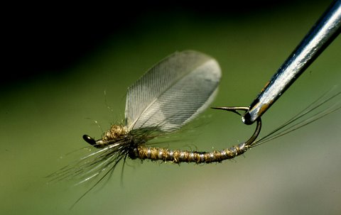 This is an imitation beautifully tied by one of my talented friends. The hook itself has a shape suggesting the curve of a mayfly’s body, giving the wings a natural slant and the “legs” the right angle towards the surface. Fortunately, you do not have to achieve an academic exam in entomology in order to tie a fly that works - there are easier ways. See below one of my favorite dry-fly patterns.