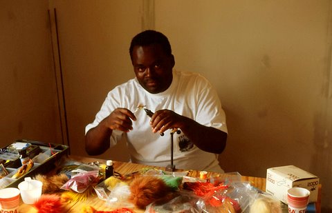 Roughly speaking, there are two separate categories of flies. Imitations, which are more or less exact replicas of the real thing, and lures, which actually do not resemble anything edible, but still catch fish year after year. Here my friend Jonas, a competent fly tier who, like most of us, like most of us, does not care about conventions, but allows his imagination to soar.