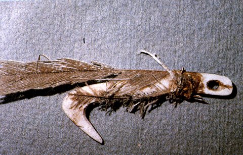 Åke Bodén, known for ”Åbosländan” (a dry fly) inherited the fly in 1902-04 from his father Levi Bodén, who in his turn got it from Lars Piitsa, a Laplander who lived 30 km upstream Övre Soppero on Lainio river. This particular fly, already known to the Piitsa family for at least three generations, and created no later than 1790, was probably tied around the middle of the 18th century. Hook, from reindeer antlers decorated with cormorant feathers, “tying thread” of reindeer tendon, fastened with resin or wax.