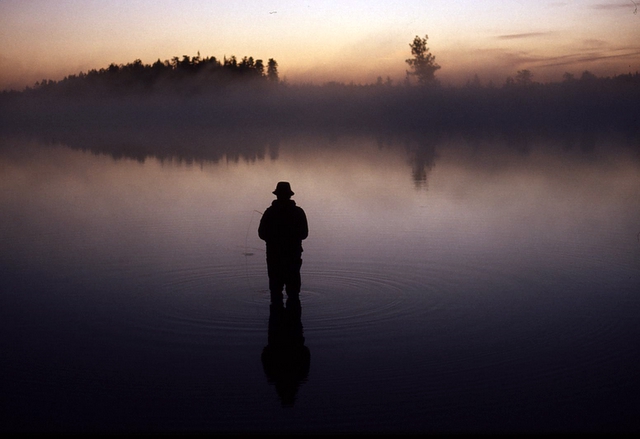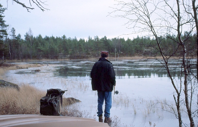 Eventually everything has an end. There have certainly been a few cold nights, but this was not what I expected. Fly rod in hand I take a couple of steps out onto the ice, it does not yield at all. A trifle disappointed I turn back to the shore, pick up a handful of dry sticks and make a little fire to warm my coffee. |