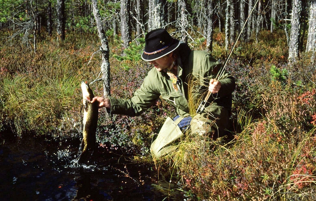 “Finnskogsriket”, the sparsely populated wilderness between the provinces of Dalarna, Hälsingland and Gästrikland, is one of my favorite fly-fishing haunts. In this vast woodland, there are a wide variety of waters, from large clear-water lakes to small tarns surrounded by marshland and forests. Like most other species of fish, pike are marked by their habitat. The clear-water pike have a pattern in light pastel shades, the tarn-pike are usually much darker, tinged with bronze along the sides and with eyes the color of amber.