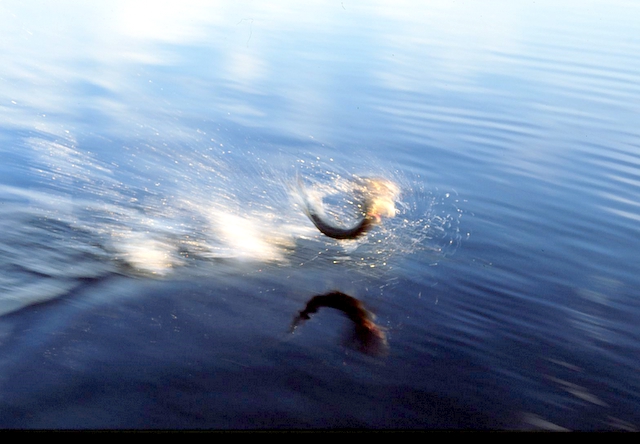 A most enjoyable way to fish for pike is from a belly-boat, demonstrated here by my fishing-buddy, Peter. To enter a belly-boat and in a single moment be transformed from a clumsy, overdressed terrestrial to a weightless, hovering amphibian is quite an experience. You move around, practically without making a sound, and can get almost on top of the pike without raising alarm.