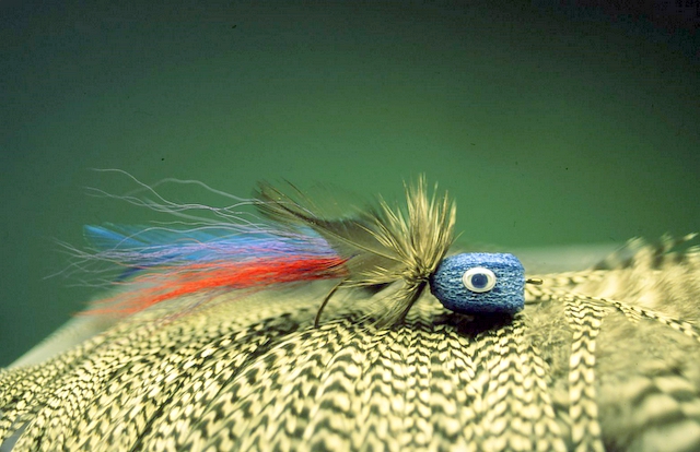 If you find it awkward to cast heavier flies made of wood or cork, this popper is for you. The head of the popper is made of a broad strip of thick foam, pierced by the hook and folded back. The doll’s eyes are attached using compound glue.