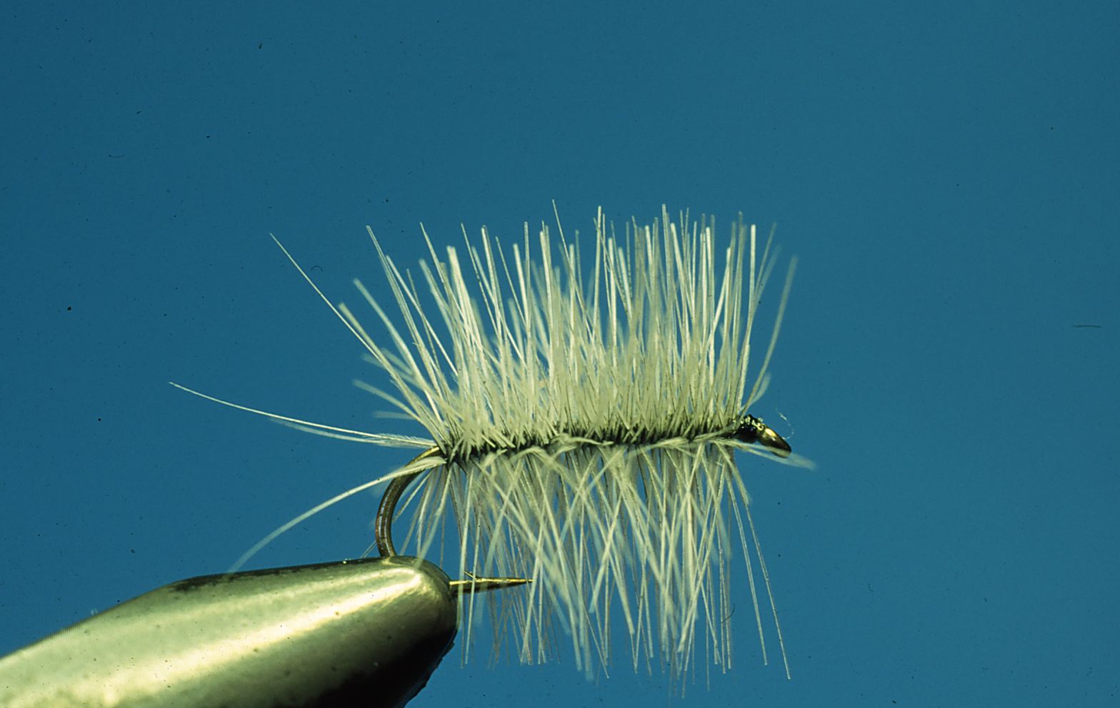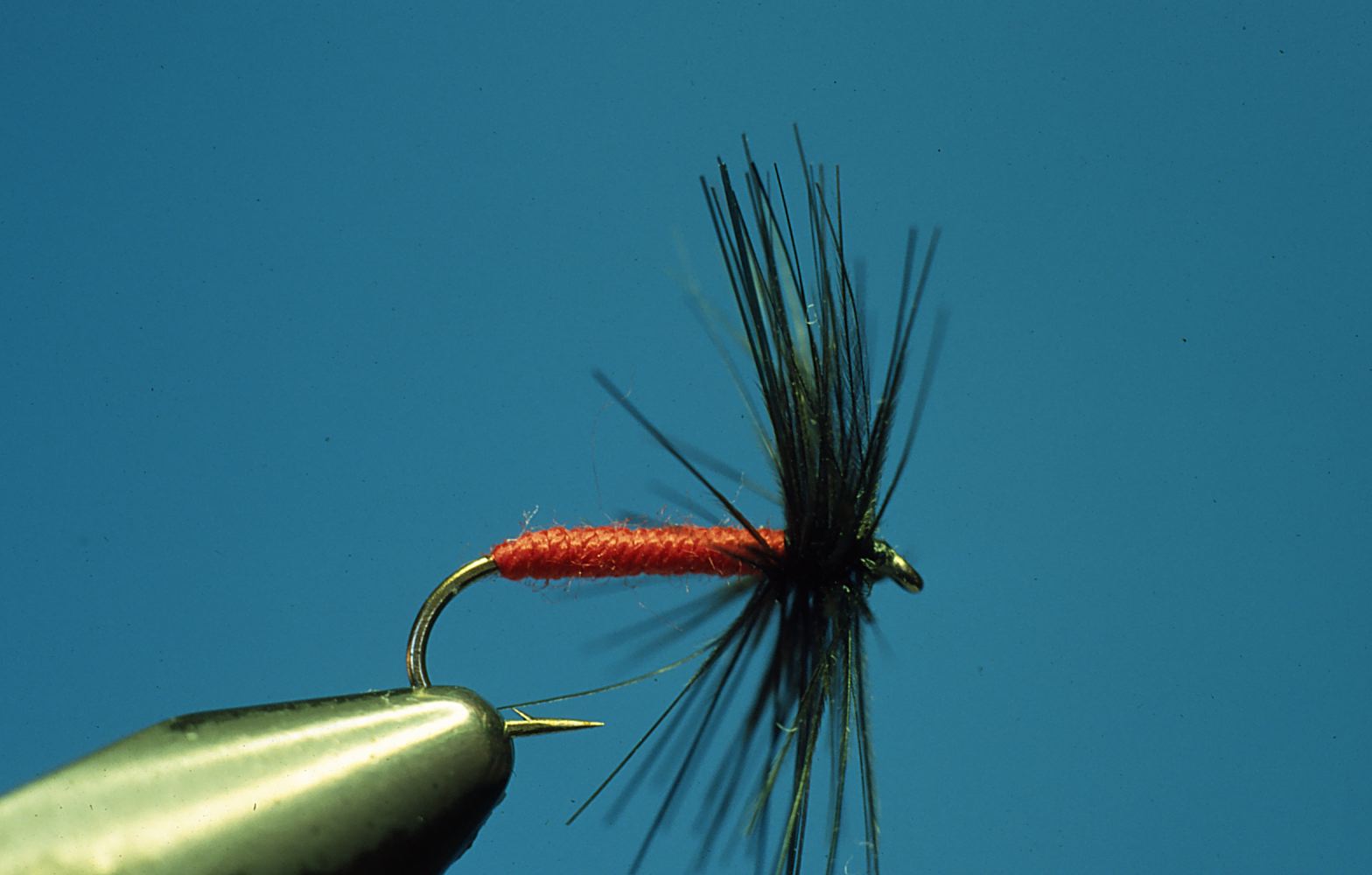 palmered and cropped hackle. Svartsuggan. Body: Sewing thread. Hackle: Black and palmered Gråsuggan. Body: Sewing thread. Hackle: Grey, palmered |