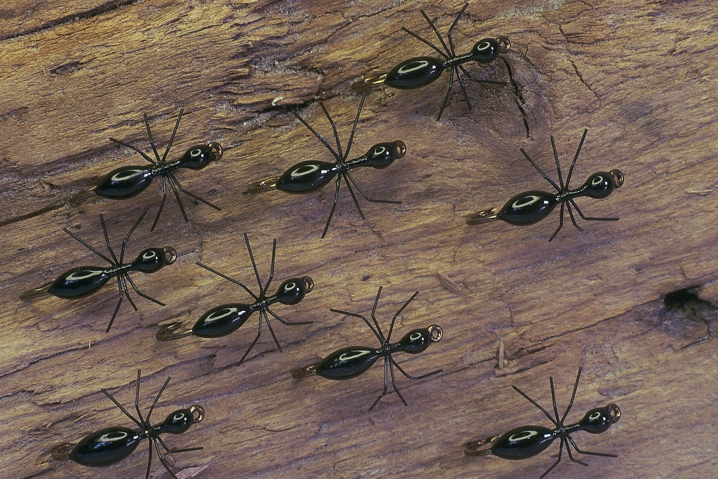 Bintrådsmyran. Body and head formed by tying thread and lacquered. Two turns of hackle to represent legs. Hook size 12-14.