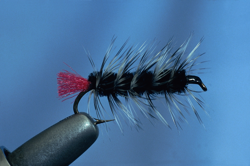 Woolly Worm. Representing a hairy larva, it is one of my absolute favorites. My own variant has a lime-green tag, body of brown chenille and a black hackle with the inside turned toward the hook eye. I weight it down with copper thread and usually tie it on a No. 10 streamer hook.
