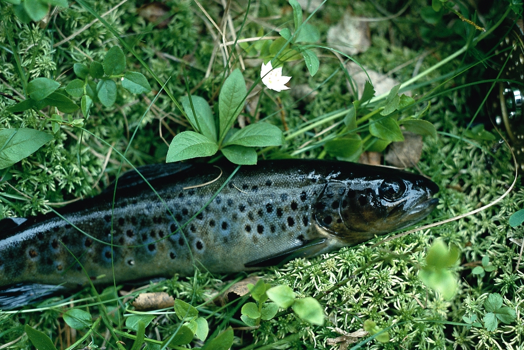 As opposed to the previous one, this trout comes from a creek with humus colored water shaded by thick pine forest. It has taken on a color adapted to its surroundings and due to poor insect life, the fish has grown very slowly.