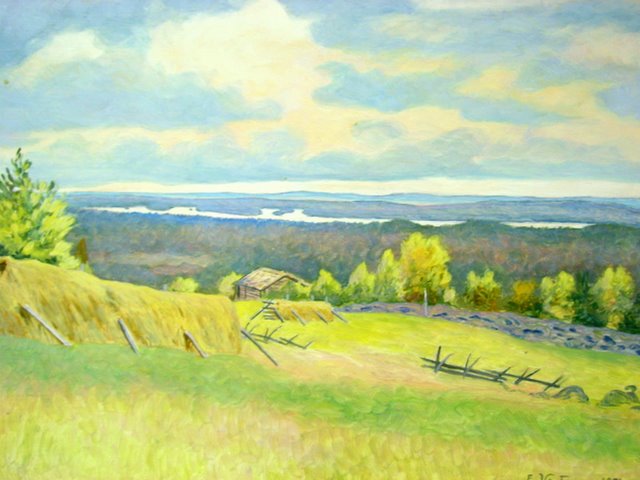 Another of Vestgren’s paintings shows the view from a hill north of the village. The meadow where Elof had set up his easel was a popular place for outings and pick-nicks. In the back of this picture, you get a view of Ågsjön under a cloudy sky. There is not a trace left of the meadow and the barn. The once open landscape, is today spoiled by a tall forest.