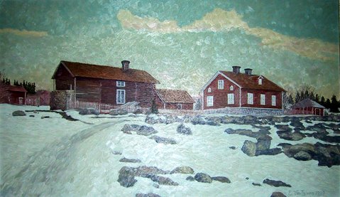 This particular milieu exists only on Vestgren’s painting from 1939. Evidently, the picture was created in early spring when the snow had started to melt around the rocks in the foreground. The biggest house, where Elof himself lived during a period, was commonly called “Värmland”, since it was built by carpenters from the province of Värmland at the beginning of the 20th Century.